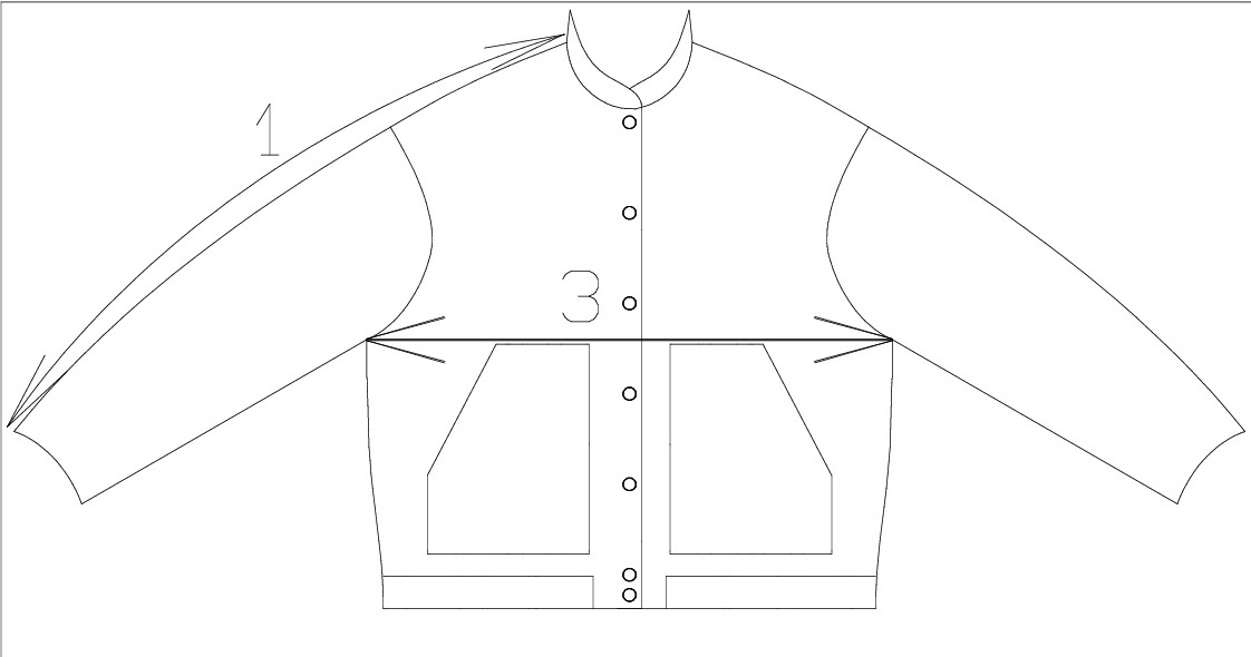 Застежка центральная бортовая на кнопки. На деталях полочки накладные карманы с отстрочками. Спинка со швом по середине. Рукав с локтевым и нижним швами. Горловина обработана воротником стойкой. В подгибку по низу изделия вставлена резинка.